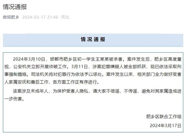 2024年3月10日,邯郸市肥乡区初一学生王某某被杀害。案件发生后,肥乡区公安机关立即开展侦破工作。3月11日,涉案犯罪嫌疑人被全部抓获,现已依法采取刑事强制措施。司法机关将对犯罪行为依法予以惩处。案件发生以来,相关部门全力做好受害人家属安抚和善后工作,各方面工作正有序进行。