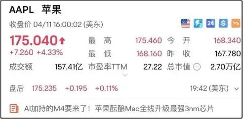 当地时间4月11日,美股收盘,苹果涨4.33%,报175.04美元,市值2.7万亿美元,单日增加1121亿美元(约合人民币8113亿元)。