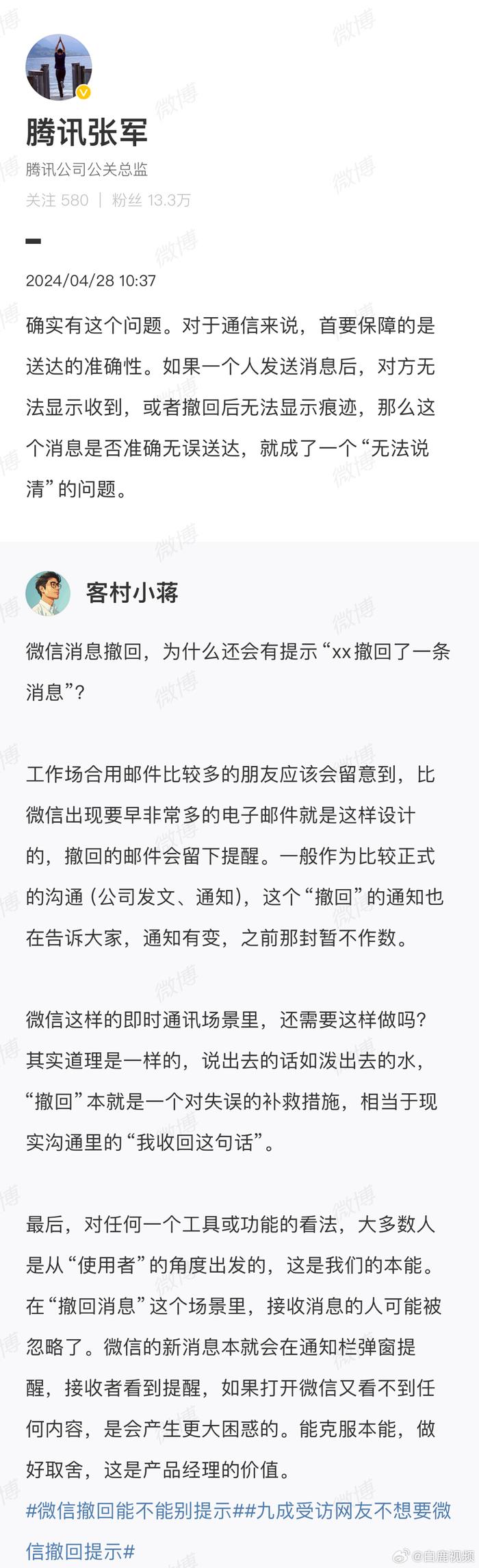 4月28日,针对“微信消息撤回,为什么还会有提示xx撤回了一条消息?”的问题,腾讯张军回应称:确实有这个问题。对于通信来说,首要保障的是送达的准确性。