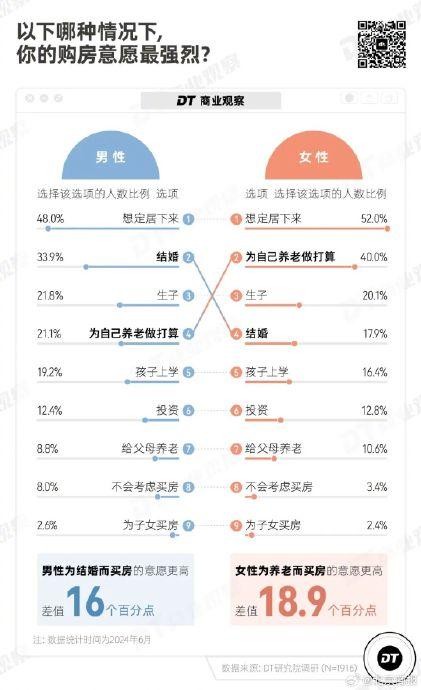 相比之下,女性更多为养老而买房,男性更多为结婚而买房,但为结婚而买房的男性也只有不到4成。(DT商业观察)
