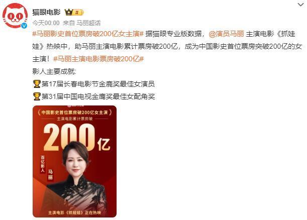 据猫眼专业版数据,马丽主演电影《抓娃娃》热映中,助马丽主演电影累计票房破200亿,成为中国影史首位票房突破200亿的女主演!