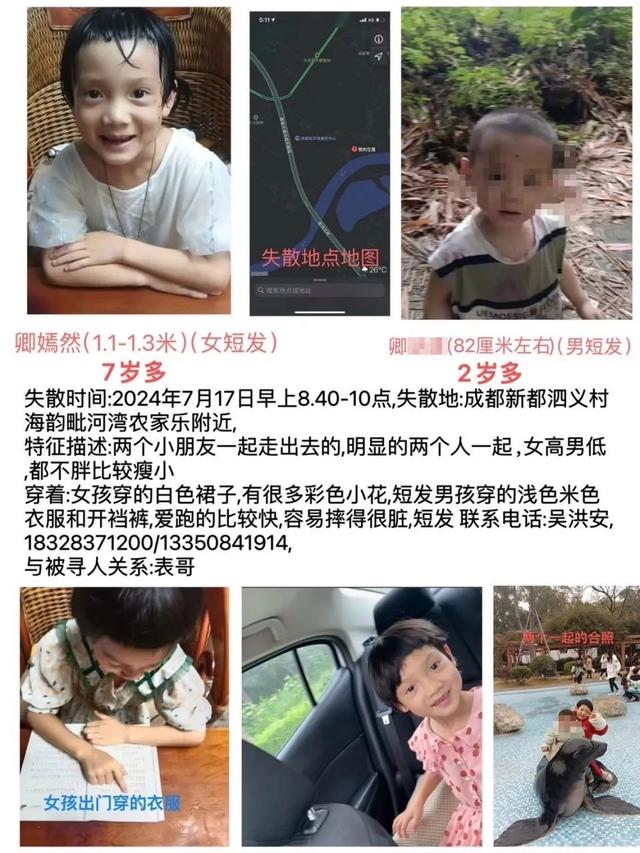 寻人启事内容显示,失踪姐姐名叫卿嫣然,今年7岁,弟弟今年3岁,于2024年7月17日早上10点左右,在四川省成都市新都区泗义村3组海韵毗河湾附近走失。