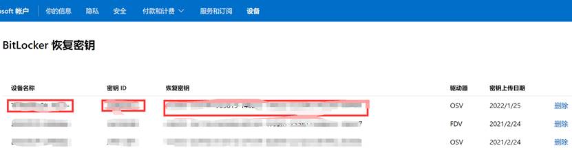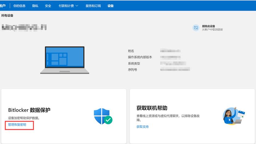 第三步:在打开的详细信息界面点击管理恢复秘钥,即可查询当前设备的秘钥。