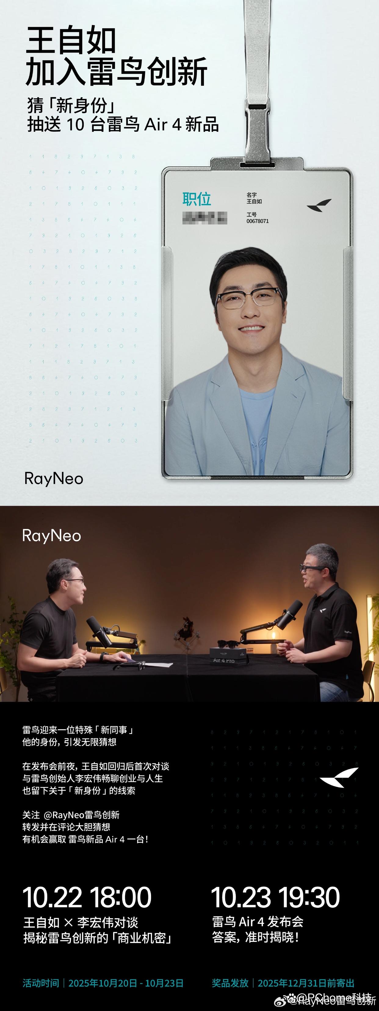 宣传海报显示,雷鸟创新将举办两场重磅活动:10月22日18:00,王自如将与雷鸟创始人李宏伟展开对谈,揭秘雷鸟创新“商业机密”;10月23日19:30,雷鸟Air 4新品发布会将揭晓所有答案。