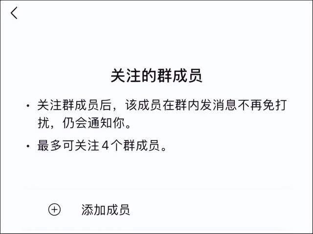 先前在开启消息免打扰后,下方第二个选项为“关注的群成员”,最多可关注 4 个群成员,关注后他们在群内发消息不再免打扰,仍会通知。