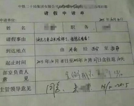 看这则新闻,单从标题笔者仅以为只是学生的卖萌之作,却不曾想到这被媒体称为“史上最不忍拒绝”的请假条却承载着万千铁路建设者们、守护者们的 辛酸泪。一时间,心被这句“快忘了老公长啥样了”的玩笑话给深深触动,更被这济南经西安至拉萨往返10天的假期感到万分同情。一张简简单单的请假条不仅让 铁路人的“候鸟”情跃然纸上,更折射出万千铁路人的无私与悲情。