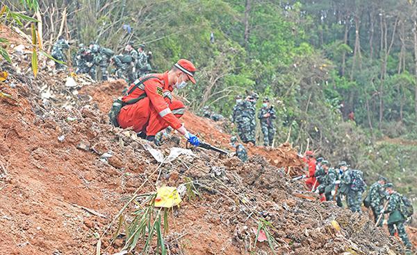 3月22日,工作人员在东航MU5735客机坠毁事故现场搜索黑匣子。新华社 图东航客机坠毁已进入第三天。此前,3月21日14时38分许,东方航空公司MU5735航班执行昆明-广州任务时,在广西梧州市上空失联并坠毁。机上载有乘客123人、机组人员9人。