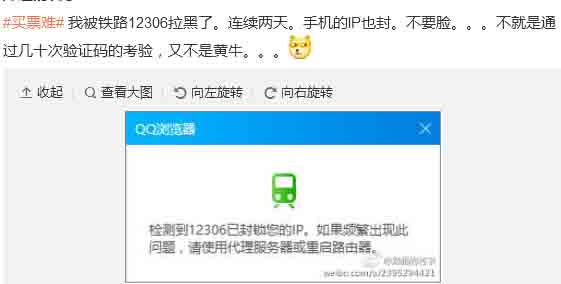 由于12306网站为了防止黄牛等恶意刷票行为,采用了“封”IP地址的技术手段,由于不是智能识别,此种手段可能会误伤不少正常购票的旅客。