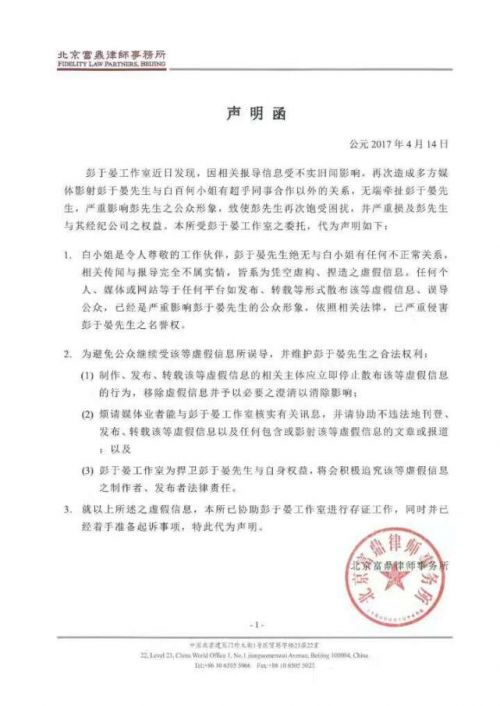 “经纪团队已多次澄清彭于晏与白百何并无同事以外关系,此次仍遭扭曲报道,我们对此表示遗憾与不满”。“工作室今以律师函再次正式澄清,恳请媒体相关从业人员了解。未来,我们不再容忍恶意引用错误传闻的行为”。