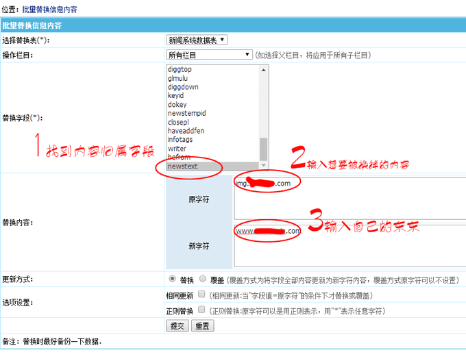 别的CMS我不知道,但是今天用帝国CMS的“批量替换字段值”功能,轻而易举地解决了上面的问题,真心为它点赞。
