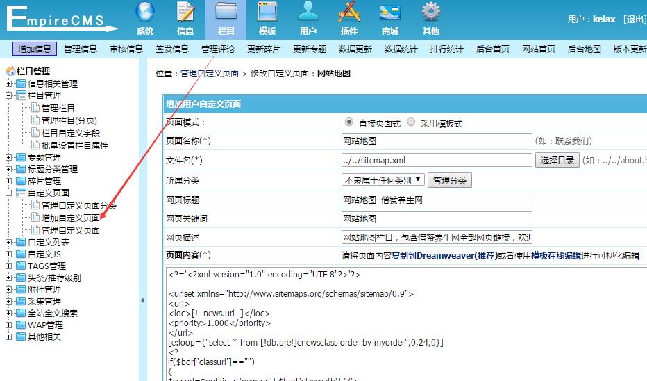 进入后台栏目 =》增加自定义页面 =》选择直接页面,页面名称为:网站地图,文件名修改为 ../../sitemap.xml