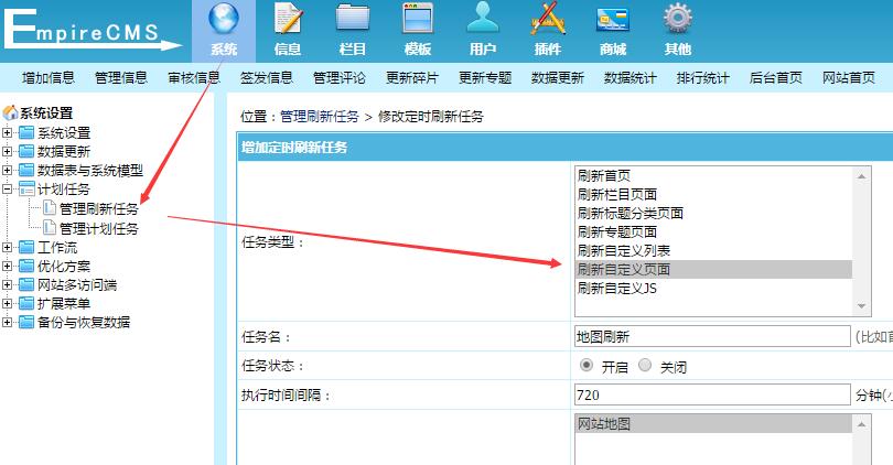 最后一步设置自动更新: 系统 =》计划任务 =》 管理计划任务 =》 刷新自定页面 =》注意执行时间设置: 因为自定刷新会影响网站性能! 所以你算好时间,我当时是在下午的15:30设置的。然后我设置是12小时候后是凌晨3:00+24小时候=720分钟;所以每隔一天自动刷新一次