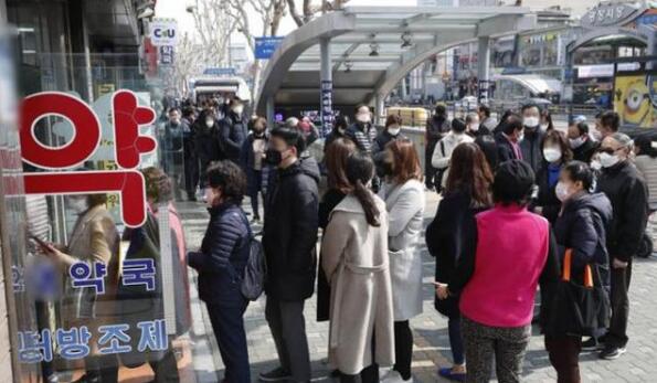 3月初,韩国首尔市民在药店排队买口罩。(纽西斯通讯社)