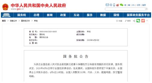 中国政府网消息,为表达全国各族人民对抗击新冠肺炎疫情斗争牺牲烈士和逝世同胞的深切哀悼,国务院今天发布公告,决定2020年4月4日举行全国性哀悼活动。在此期间,全国和驻外使领馆下半旗志哀,全国停止公共娱乐活动。4月4日10时起,全国人民默哀3分钟,汽车、火车、舰船鸣笛,防空警报鸣响。