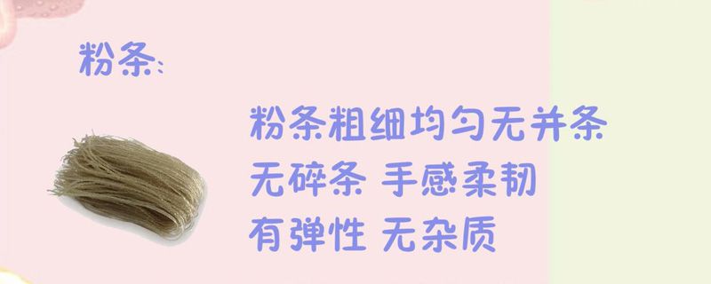 购买粉条时,要学会鉴别方法,好的粉条粗细均匀无并条,无碎条,手感柔韧,有弹性,无杂质,质量差的粉条粗细不匀,有并条及碎条,柔韧性、弹性较差,还有肉眼可见的杂质。