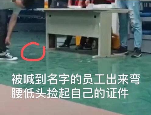三名分发证件的管理人员不停地念出员工的名字,然后将一张一张证件全部丢在地上,每一个需要领证件的员工都要走在他们面前低头弯腰,像鞠躬一样捡起证件。