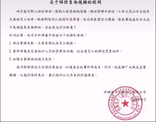 针对此事,我司立即调查并做出以下处理和承诺:1.单位管理失职,主观率团队向员工致歉。2.重新审视及完善培训人员的管理及训练,把关爱员工的理念贯穿始终。3.加强主管现场巡查与关怀。