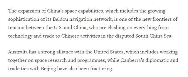 其次,路透社提到了中国在太空探索和卫星定位系统方面都与美国存在激烈的竞争关系,尤其是中国的北斗卫星系统与美国的GPS系统的竞争。同时,路透社提到了澳大利亚是美国亲密盟友,一直在太空领域与美国合作,而澳大利亚与中国的关系却出现了断裂。
