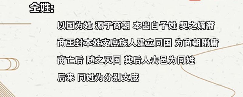 还有一种说法是避祸改姓,起源于汉朝,为司马迁之后,同样因谐音故,源于“同”。80年代中央电视台曾做过介绍, 2003年2月春节期间中央电视台十频道《百家姓》节目也做了介绍。