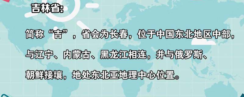 吉林省,简称“吉”,省会为长春,位于中国东北地区中部,与辽宁、内蒙古、黑龙江相连,并与俄罗斯、朝鲜接壤,地处东北亚地理中心位置。