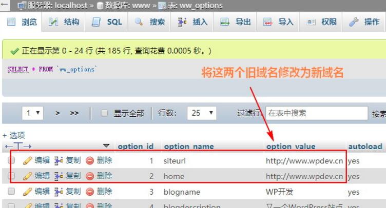 然后就可以看到数据库的 siteurl 和 home 这两个选项,将他们的值修改为新网址: