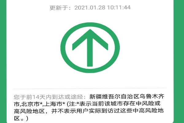 4、在2021年1月8日以前,行程卡对包含中高风险区域的地市名称的标记为红色。之后行程卡对包含中高风险区域的地市名称的标记变更为在城市名称后括号备注包含中高风险区域。并且该备注仅作为出行提示,是不关联健康状况的。