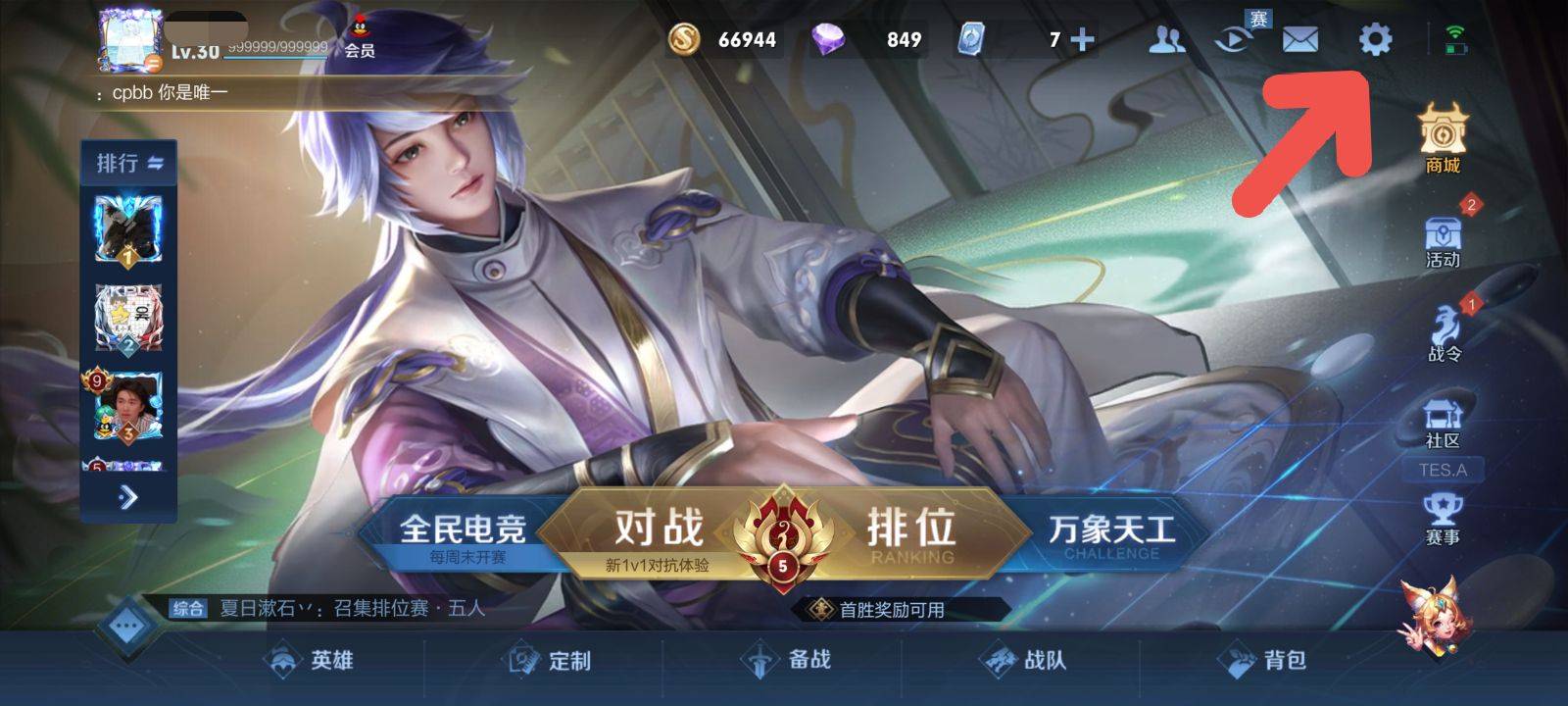 1、登录账号,进入王者荣耀主界面,点击右上角设置。