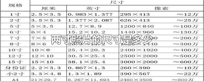 两寸照片的尺寸是3.5cm×5.3cm。照片的尺寸通常以英寸为单位,1英寸=2.54厘米。几寸照片是指照片长的一边为几寸(1寸照为短的一边)。比如5寸照片的长为2.54×5=12.7cm,12寸照片的长为2.54×12=30.5cm。