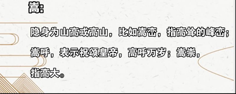 “嵩”也可以隐身为山高或高山,比如嵩峦,指高耸的峰峦;嵩呼,表示祝颂皇帝,高呼万岁;嵩崇,指高大。