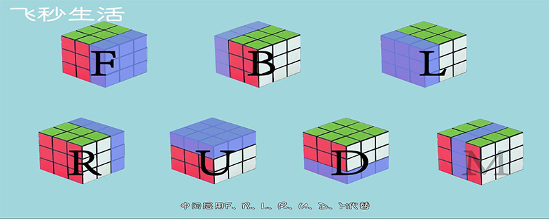 将三阶魔方的前、后、左、右、上、底、中间层用F、B、L、R、U、D、M代替,R代表右面顺时针转90度,R`表示右边逆时针旋转90°,R2表示右面顺时针旋2次90°。