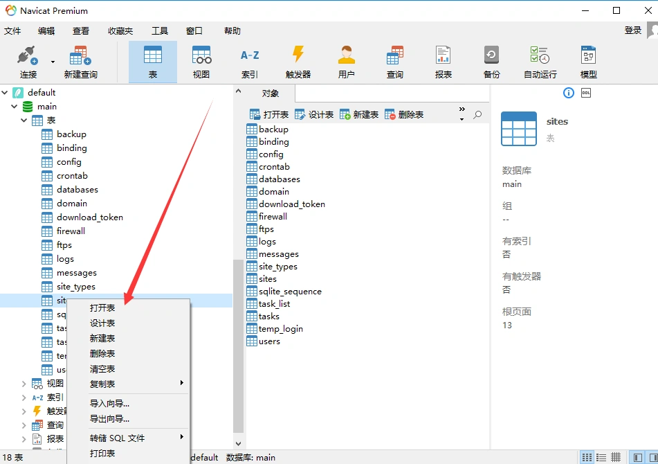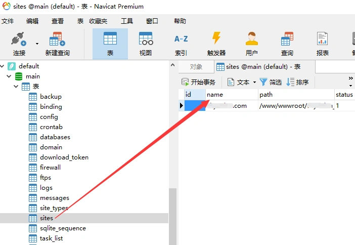 三、数据库列表找到你新建的数据库,双击打开,里面有个mian数据库,打开找到sites表,打开表,字段name就是网站名称,直接编辑修改、保存即可。
