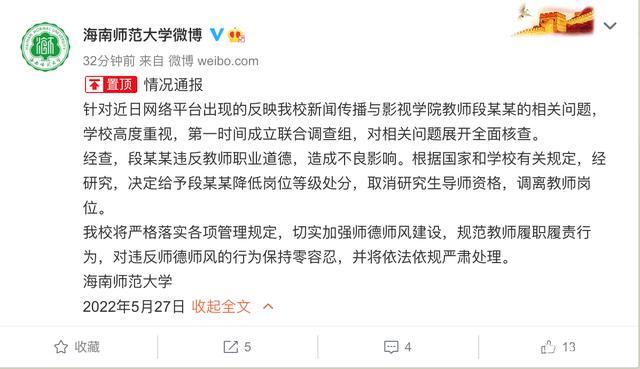 海南师范大学微博27日发布情况通报称,针对近日网络平台出现的反映我校新闻传播与影视学院教师段某某的相关问题,学校高度重视,第一时间成立联合调查组,对相关问题展开全面核查。