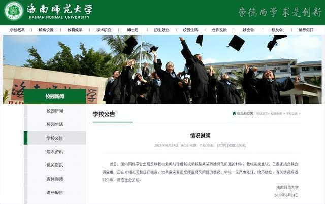 5月24日,海南师范大学官网发布通报称:已迅速成立联合调查组,正在对相关问题进行核查。