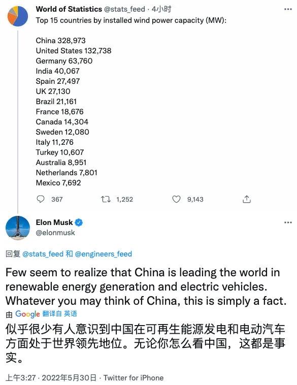 推特用户发布统计数据,公布了风电装机容量排名前15位的国家,中国以328,973兆瓦排在第一位,是排在第二位的美国的两倍多。马斯克对此发布推文称:“似乎很少有人意识到,中国在可再生能源发电和电动汽车方面处于世界领先地位。不管你怎么看待中国,这都是事实。”