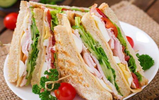 三明治在美国是非常受欢迎的快餐。它可以由几片简单的面包和几片肉、蔬菜和奶酪制成。你也可以加入你喜欢吃的不同配料。它简单的制作方法受到美国人的欢迎。不像汉堡包,三明治面包又软又薄。