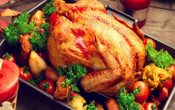 烤火鸡是西方感恩节餐桌上的主要食物之一。一整只大火鸡装满了食物,伴随着各种香料,放在烤箱里。烤火鸡有着深棕色的皮肤和明亮的颜色,这让人胃口大开。它被切开,浇上调味汁,一口吃掉,给他们一种强烈的满足感。
