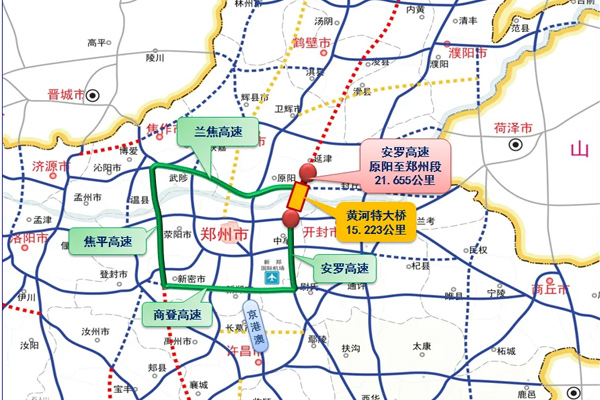 3、至原阳县太平镇虎张村西北与兰考至原阳高速-封丘至原阳段交叉,顺接安罗高速原阳至郑州(兰原高速至连霍高速)段的起点,最终到达项目终点。