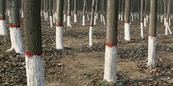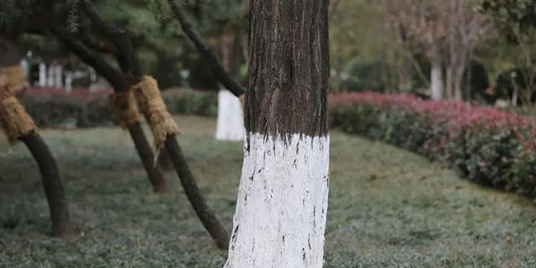 2、防止冻伤:若树干刷上白色的石灰水,可以让40%-70%的阳光被反射,从而减少昼夜温差,起到保暖和避免树干冻伤的作用。