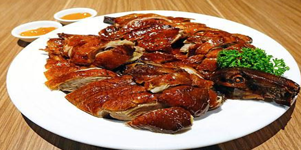 3、烧鸭,即是广式烤鸭,是广东地区的一道传统名菜,具有皮脆、肉嫩、骨香、肥而不腻的特点。