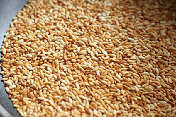 3、热锅后调成中小火,将干燥的大米倒入锅中,炒至微黄色后加入八角和干红辣椒继续炒香。炒够2分钟后倒出大米,挑出辣椒和八角备用。待炒大米自然冷却,再用搅拌机将其打至细颗粒状。注意打碎时间不可太长,否则会打成过于细腻的米粉。