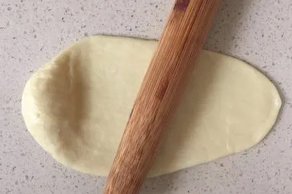 3.对发酵好的面团进行排气,并分割成2份揉圆,再发酵15分钟。将发酵好的面团按扁,从中间向两端擀成长条。面团翻面并旋转90度,沿长边从上往下卷起,使之呈长条状,再擀成长条。