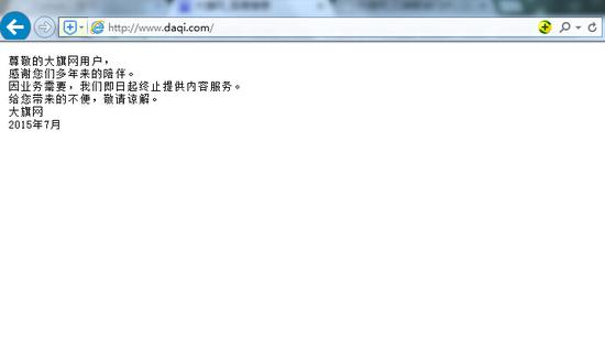 当前用户登陆大旗网页面将出现以下公告提示:因业务需要,我们即日起终止提供内容服务。给您带来的不便,敬请谅解。