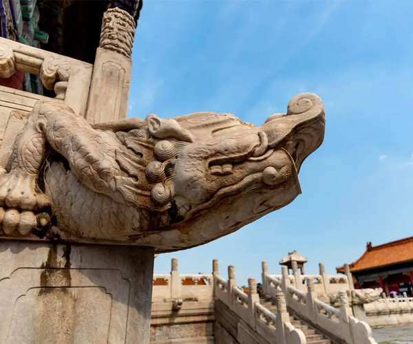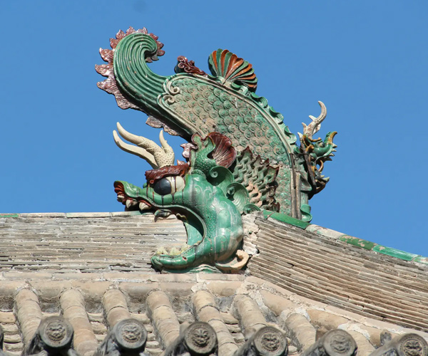 2、螭吻:形似兽,是老九,平生好斗,其形象为殿台角上的走兽。《太平御览》记载“鱼虬”为螭吻的前身,属水性,其原型可能是深海大鲸。螭吻喜欢东张西望,常被应用在中国宫殿建筑的屋脊上,做张口吞脊状,并以一剑固定之。