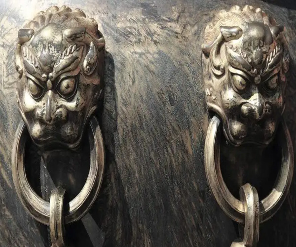 9、椒图:形似螺蚌,是第九子,性好闭,反感别人进入其巢穴,因此其形象多为装饰于门的铺首衔环。椒图遇到外敌侵犯会闭紧壳口,人们将其应用在门上,取其“紧闭”之意,以求平安。另外椒图性好僻静、忠于职守,因此常被装饰在大门铁环兽或挡门的石鼓上。