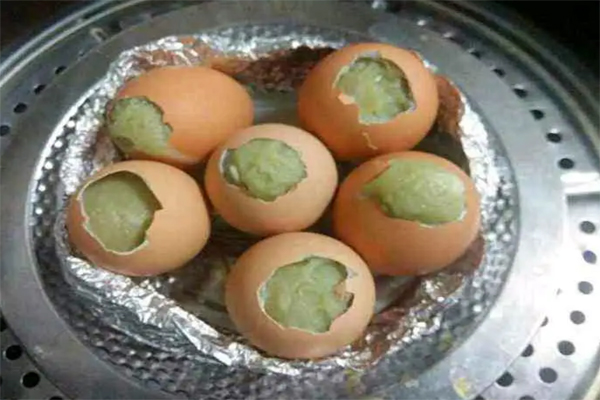 3、检查蒸煮效果:等到实蛋夜全部变成绿色之后,就是蒸好了,可以用筷子扎一下,检查一下里面有没有熟。