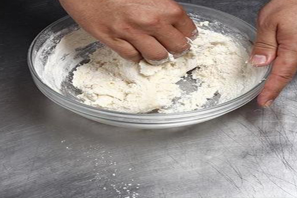 1、首先将自发粉倒入容器中,再加入温水进行搅拌均匀,直至变成絮状,就可以揉成面团了。