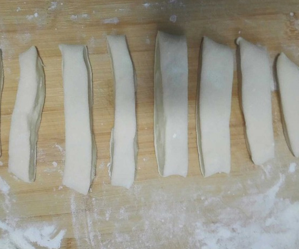 3、将发酵好面团擀成扁圆状,然后切成宽度合适的条状备用。