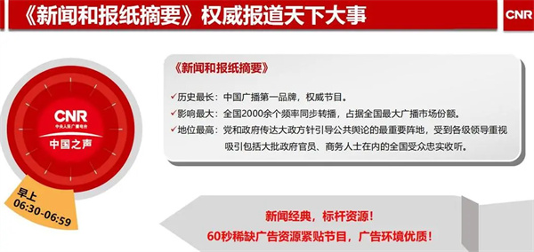 3、新闻和报纸摘要除了早上6点半的首播以外,在早上7点的经济之声和早上9点的中国之声还会有重播,但特殊情况下可能会延时。