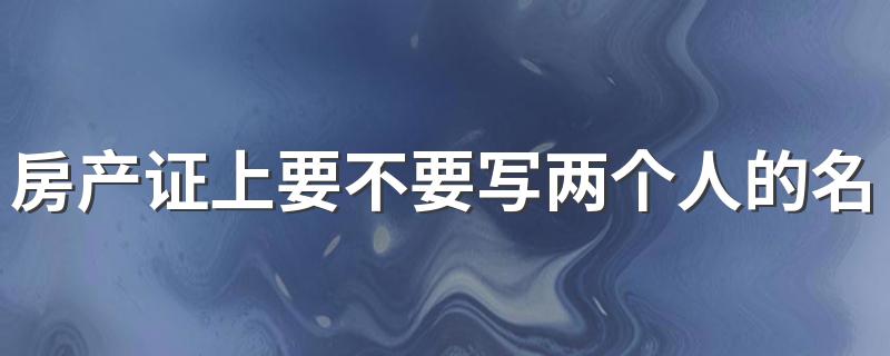 房产证上不建议写两个人的名字因为。房产证上写两个人的名字的弊端有很多:在办理房产权的变更等相关手续时,必须两个人都同时到场;在面对离婚时,还有可能需要进行财产分割。因此,为了防止今后出现麻烦,不提倡在房产证上写2个人的名字。