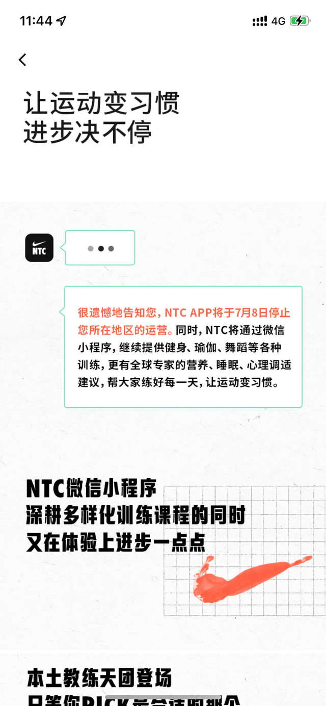 NRC APP显示:很遗憾地告知您,NTC APP将于7月8日停止您所在地区的运营。同时,NTC将通过微信小程序,继续提供健身、瑜伽、舞蹈等各种训练,更有全球专家的营养、睡眠、心理调适建议,帮大家练好每一天,让运动变习惯。